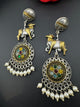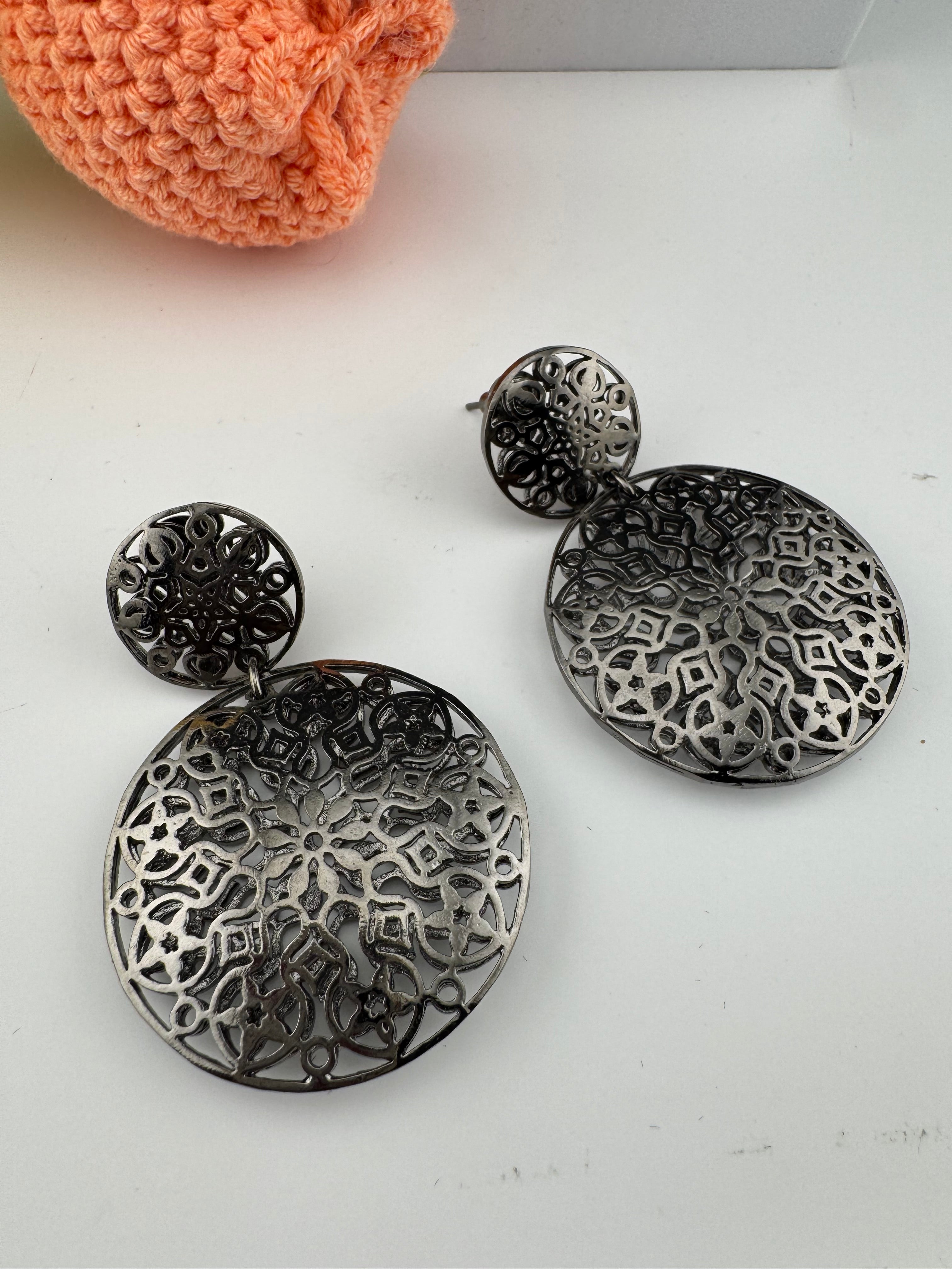 This a beautiful German silver jewelry, in modern looking finish, Oxidized self cut detailing, this earring has metal cuts detailed work. This is very beautiful to look at and a perfect one for regular wear and also Indian weddings.