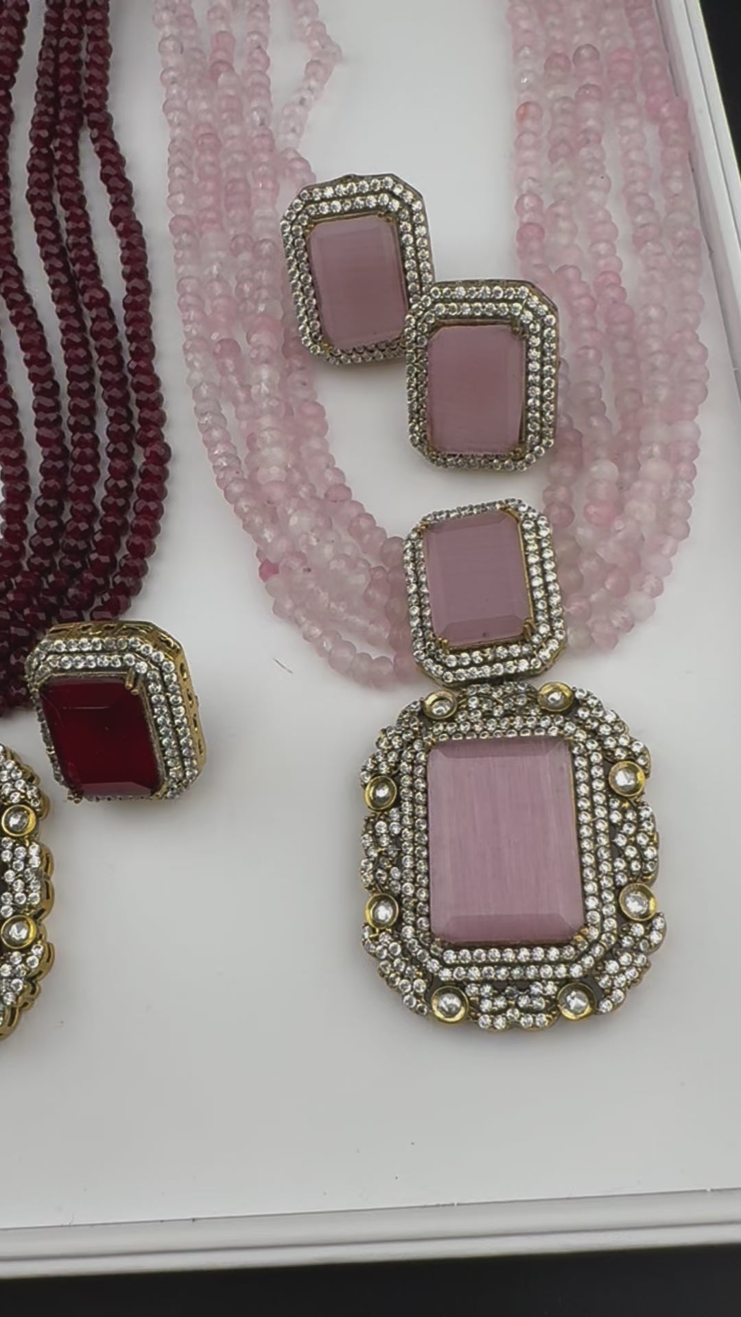 This is a gorgeous modern Premium quality fusion in HQ CZ, natural stones and Onyx beads necklace, statement Long necklace set with matching earrings is very unique in itself. This is a modern style Rani Haar/Long set which also suits as bridal necklace. This is so beautiful to look at and a perfect one for Weddings and party wear.